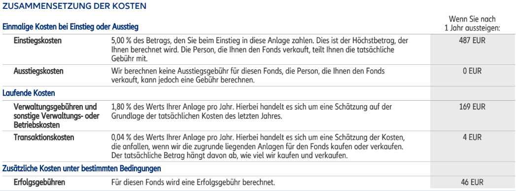Die Kosten des Fonds entnehmen wir dem Ausschnitt aus den “Wesentlichen Anlegerinformationen”. Dabei sind folgende Kostenarten zu unterscheiden: