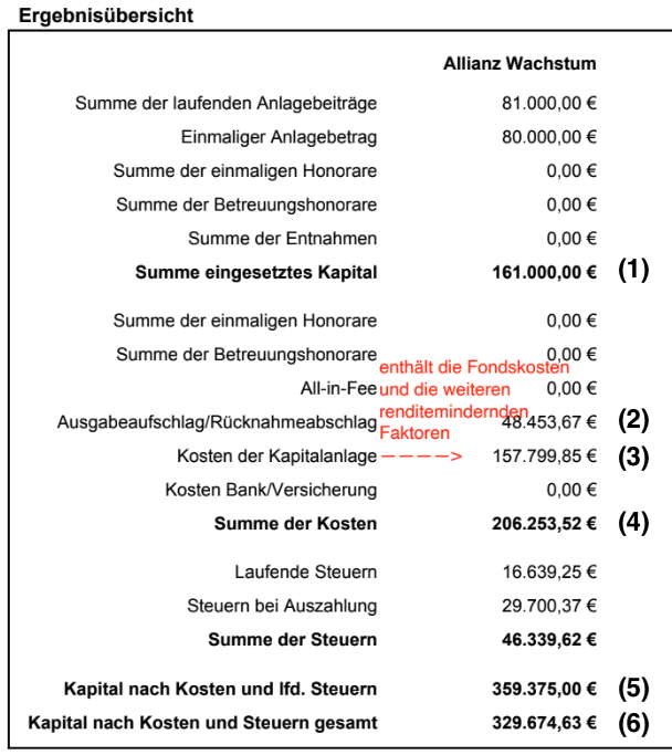 Laut den Wesentlichen Anlegerinformationen des Allianz Wachstum Europa A Fonds, den wir zur Prüfung erhalten haben, betragen die jährlichen laufenden Kosten 1,40 Prozent des gesamten Fondsguthabens. Da die zukünftige Entwicklung des Fonds nicht vorhersehbar ist, lassen sich die laufenden Fondskosten nicht exakt im Voraus beziffern. Unsere finanzmathematische Analyse basiert auf der Annahme einer konstanten Fondsentwicklung sowie unverändert laufender Fondskosten.