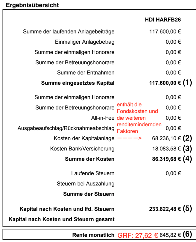 Aufgrund der nicht vorhersehbaren Vertragsentwicklung ist es nicht möglich, die Gamma-Kosten vor Vertragsabschluss exakt zu beziffern. Unter der Annahme einer gleichbleibenden Vertragsentwicklung lässt sich jedoch ein geschätzter Kostenbetrag für die gesamte Vertragslaufzeit ermitteln. Weiter unten werden wir im dargestellten finanzmathematischen Gutachten zur HDI CleverInvest Basisrente den Gesamtbetrag der Versichererkosten sehen. Wenn wir davon die konkret berechenbaren anderen Versichererkostenarten abziehen, ergibt sich nach unseren Berechnungen ein Restbetrag für die Gamma-Kosten
