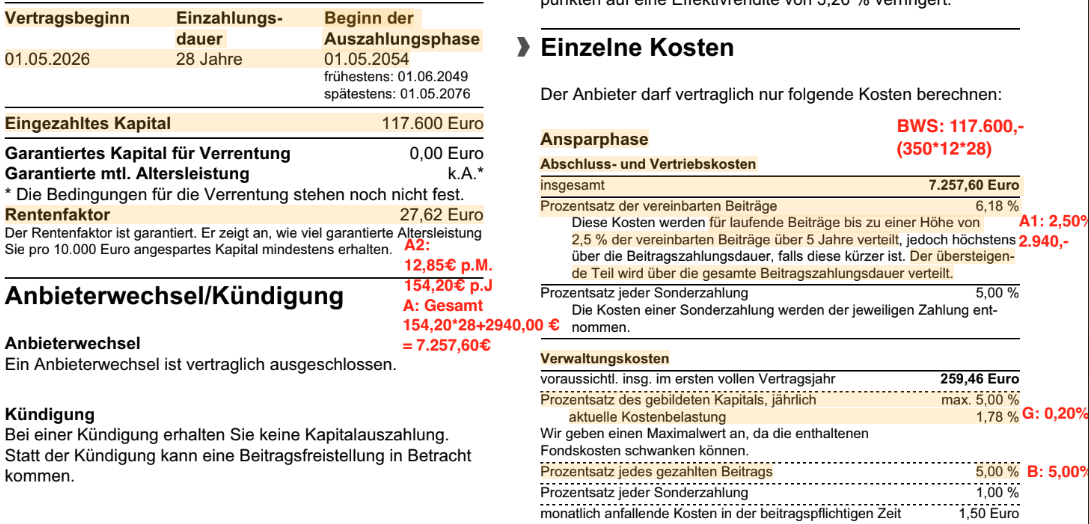 (Auszug aus dem uns vorgelegten Vertragsangebot der HDI CleverInvest Basisrente, in dem wir die recherchierten Kosten in Rot hinzugefügt haben)