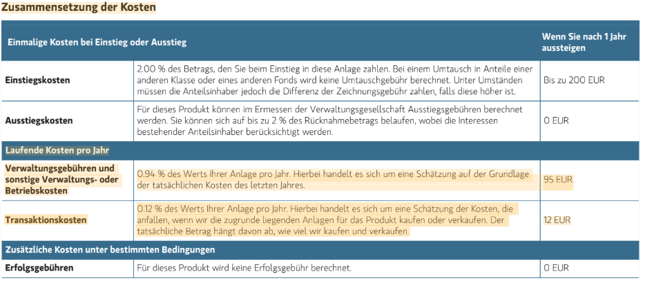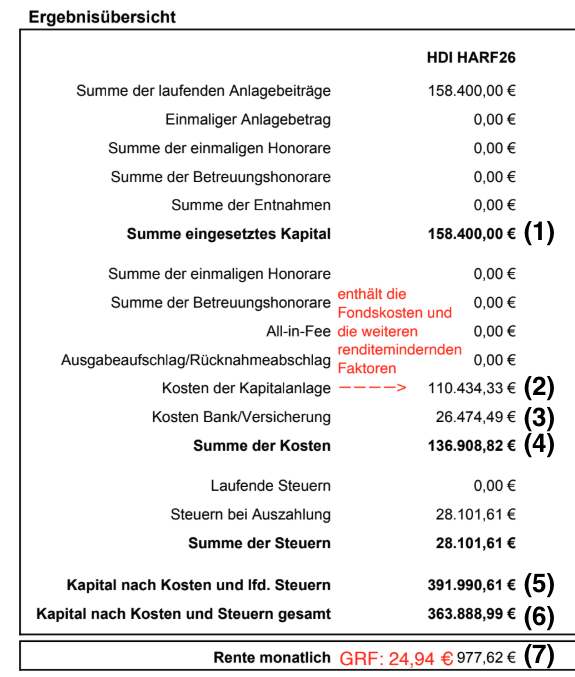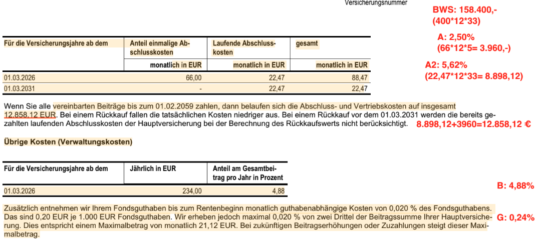 (Auszug aus dem uns vorgelegten Vertragsangebot der HDI CleverInvest Privatrente, in dem wir die recherchierten Kosten in Rot hinzugefügt haben)
