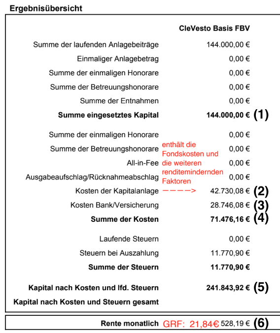 (Auszug aus dem uns vorgelegten Vertragsangebot der Helvetia CleVesto Basis, in dem wir die recherchierten Kosten in Rot hinzugefügt haben)