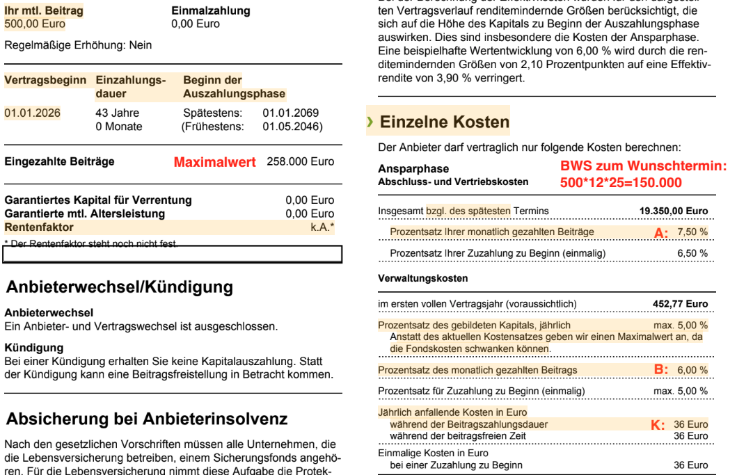 500,00 Euro x 12 Monate = 6.000,00 Euro Jahresbeitrag x 25 Jahre Beitragszahldauer