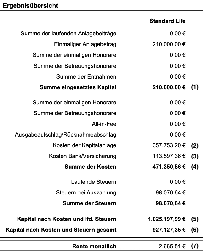 In unserem Vertragsangebot der Standard Life ParkAllee haben wir jährliche Gamma-Kosten in Höhe von 0,65 Prozent auf das jeweils gesamte Vertragsguthaben ermittelt.