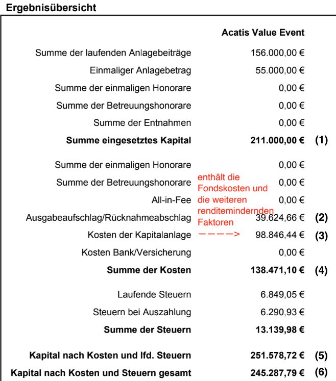 Laut den Wesentlichen Anlegerinformationen des Acatis Value Event Fonds, den wir zur Prüfung erhalten haben, betragen die jährlichen laufenden Kosten 1,80 Prozent des gesamten Fondsguthabens. Da die zukünftige Entwicklung des Fonds nicht vorhersehbar ist, lassen sich die laufenden Fondskosten nicht exakt im Voraus beziffern. Unsere finanzmathematische Analyse basiert auf der Annahme einer konstanten Fondsentwicklung sowie unverändert laufender Fondskosten.