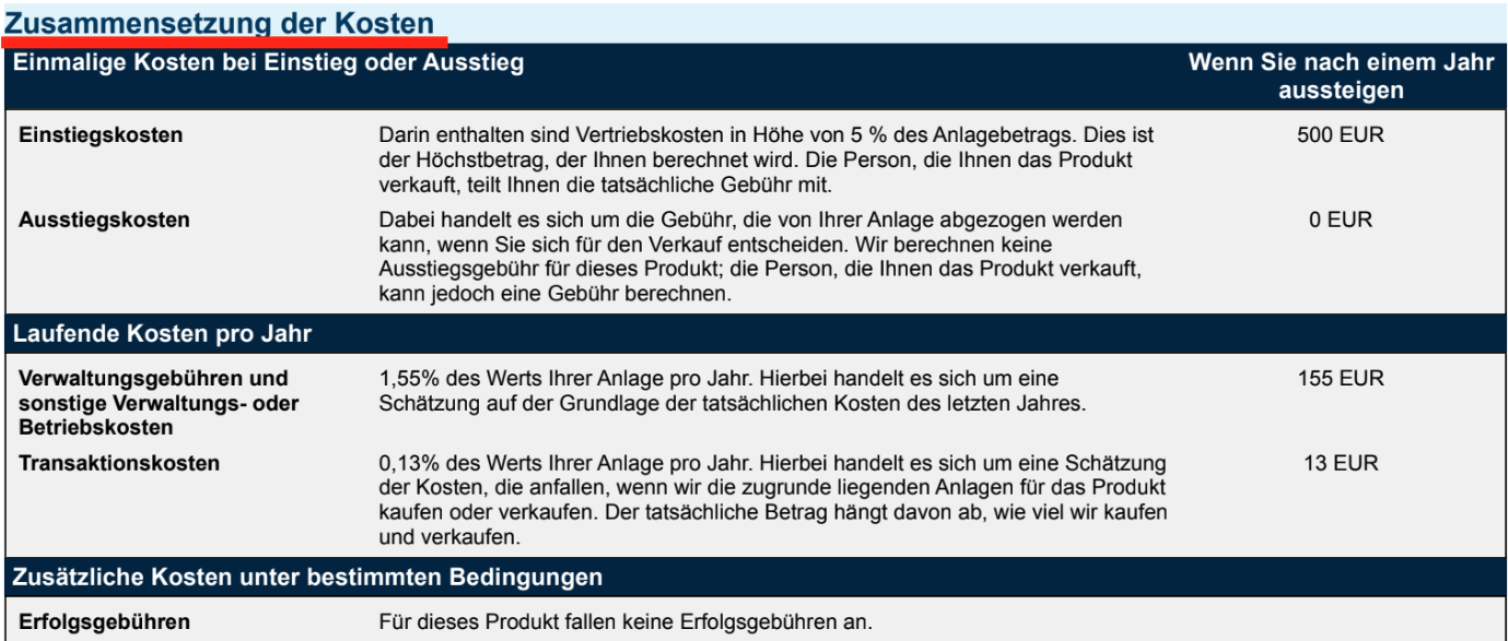Die Kosten des Fonds entnehmen wir dem Ausschnitt aus den “Wesentlichen Anlegerinformationen”. Dabei sind folgende Kostenarten zu unterscheiden: