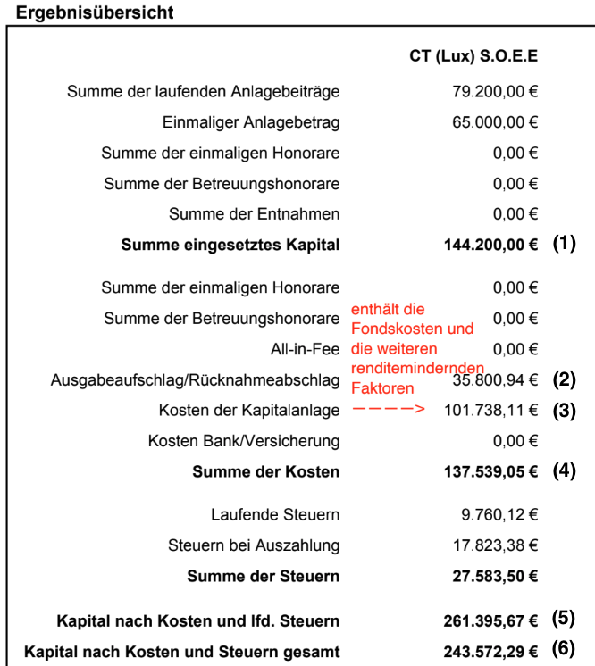 Laut den Wesentlichen Anlegerinformationen des CT (Lux) Sustainable Opportunities European Equity Fonds, den wir zur Prüfung erhalten haben, betragen die jährlichen laufenden Kosten 1,55 Prozent des gesamten Fondsguthabens. Da die zukünftige Entwicklung des Fonds nicht vorhersehbar ist, lassen sich die laufenden Fondskosten nicht exakt im Voraus beziffern. Unsere finanzmathematische Analyse basiert auf der Annahme einer konstanten Fondsentwicklung sowie unverändert laufender Fondskosten.