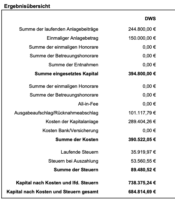 Laut den Wesentlichen Anlegerinformationen des DWS Vermögensbildungsfonds I, den wir zur Prüfung erhalten haben, betragen die jährlichen laufenden Kosten 1,45 Prozent des gesamten Fondsguthabens. Da die zukünftige Entwicklung des Fonds nicht vorhersehbar ist, lassen sich die laufenden Fondskosten nicht exakt im Voraus beziffern. Unsere finanzmathematische Analyse basiert auf der Annahme einer konstanten Fondsentwicklung sowie unverändert laufender Fondskosten.