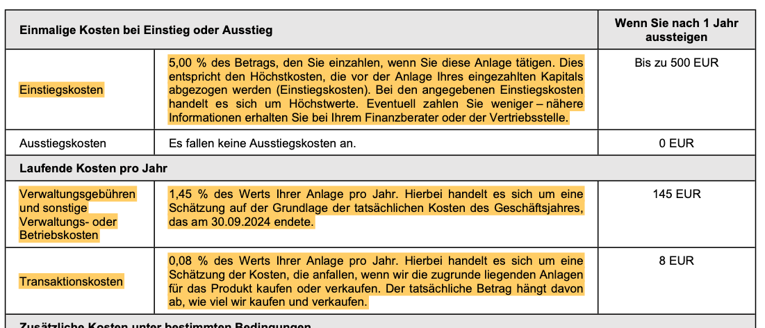 Die Kosten des Fonds entnehmen wir dem Ausschnitt aus den “Wesentlichen Anlegerinformationen”. Dabei sind folgende Kostenarten zu unterscheiden: