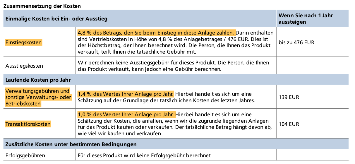 Die Kosten des Fonds entnehmen wir dem Ausschnitt aus den “Wesentlichen Anlegerinformationen”. Dabei sind folgende Kostenarten zu unterscheiden: