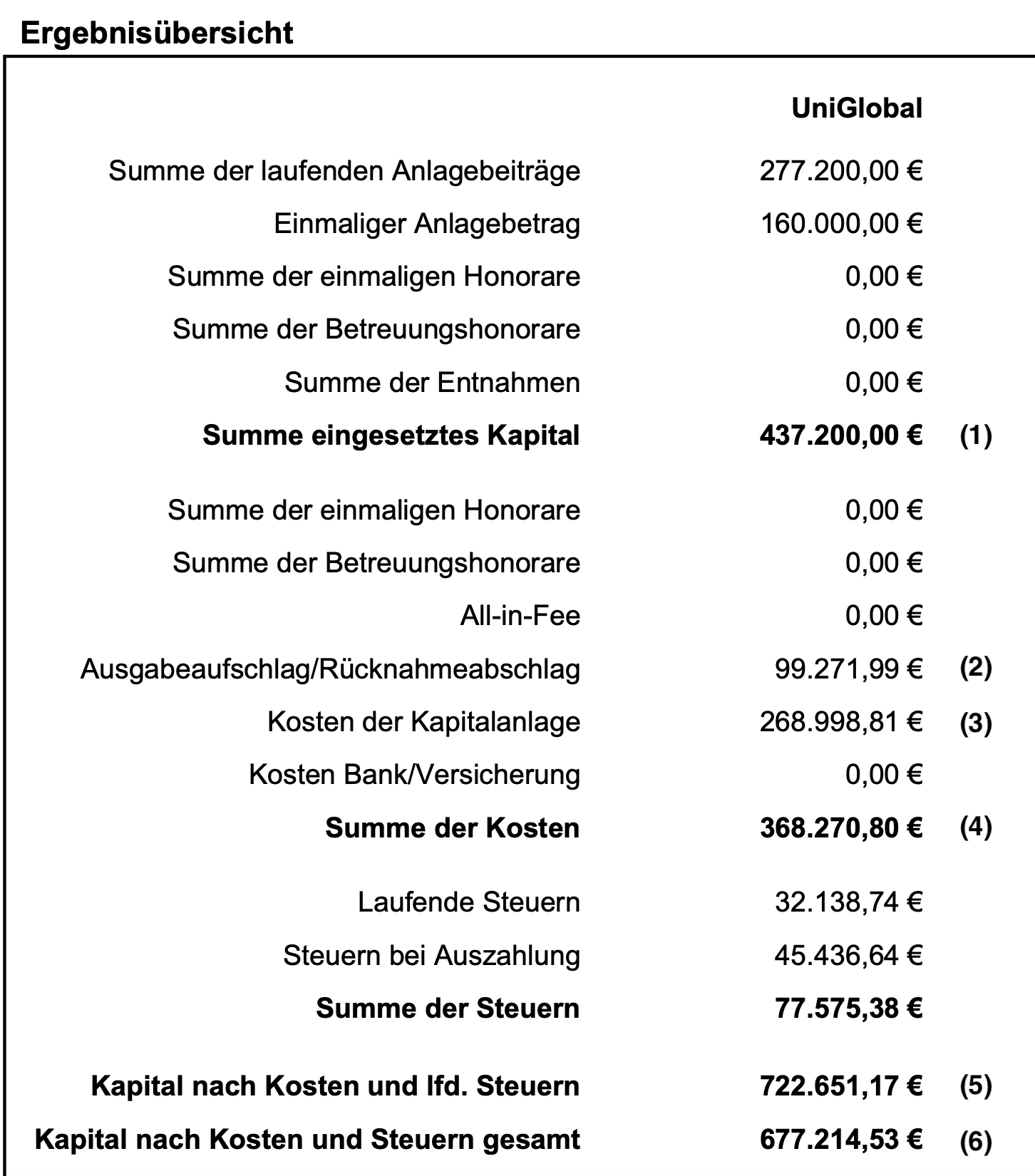 Sehr auffällig ist in diesem Beispiel die Gesamtbelastung von 368.270,80 Euro, die nach unseren Berechnungen über alle renditemindernden Faktoren im Verhältnis zum eingesetzten Kapital deutlich zu hoch ist.
