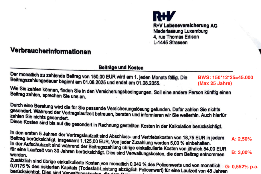 (Auszug aus dem uns vorgelegten Vertragsangebot der R+V StuttgartConcept, in dem wir die recherchierten Kosten in Rot hinzugefügt haben)